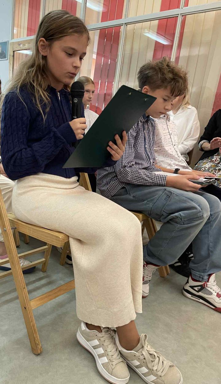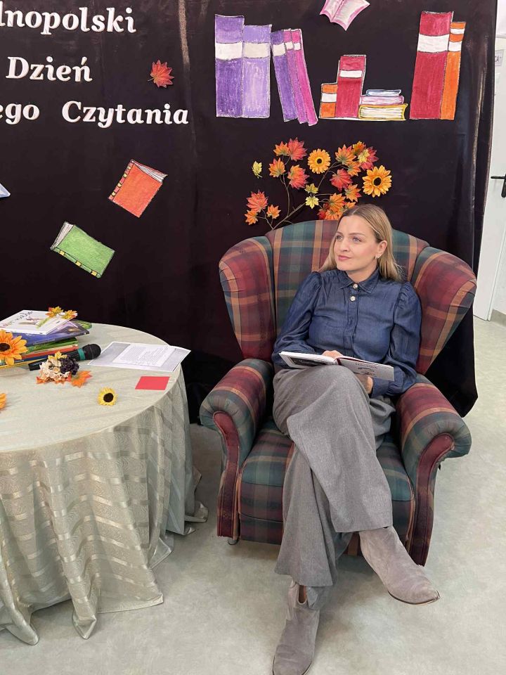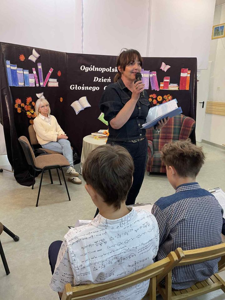 Wybrani uczniowie (widoczni na wspólnej fotografii z panią Katarzyną) mogli sprawdzić swoje umiejętności, odczytując tekst z podziałem na role. Narratorem była prawdziwa aktorka!