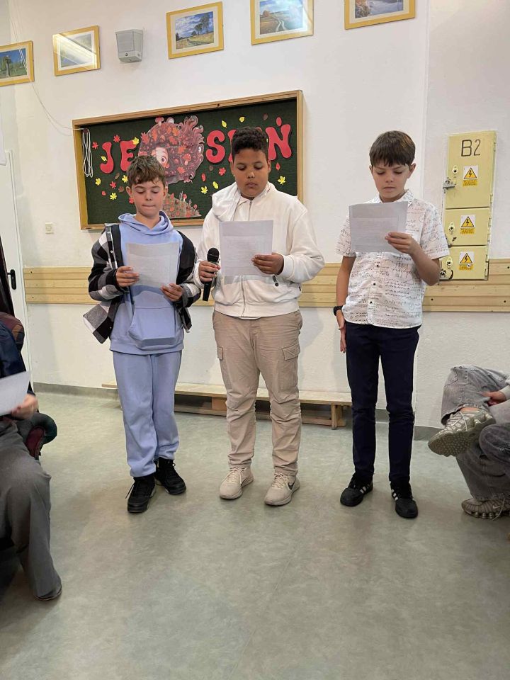 Przed widownią – którą stanowiły wymienione klasy, najwierniejsi czytelnicy naszej szkolnej biblioteki – wystąpili także: Janek Dziuba z fraszką „Na zdrowie”, Wiktor Wołagniewicz oraz Magdalena Tkaczyk z baśniami Hansa Christiana Andersena: „Świniopas” i „Calineczka”.