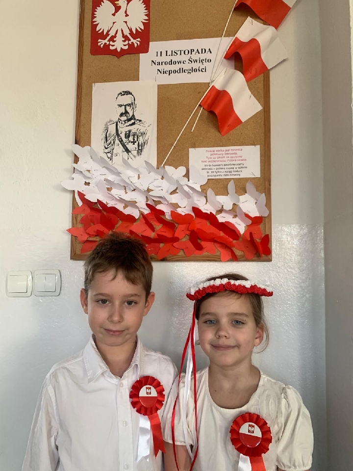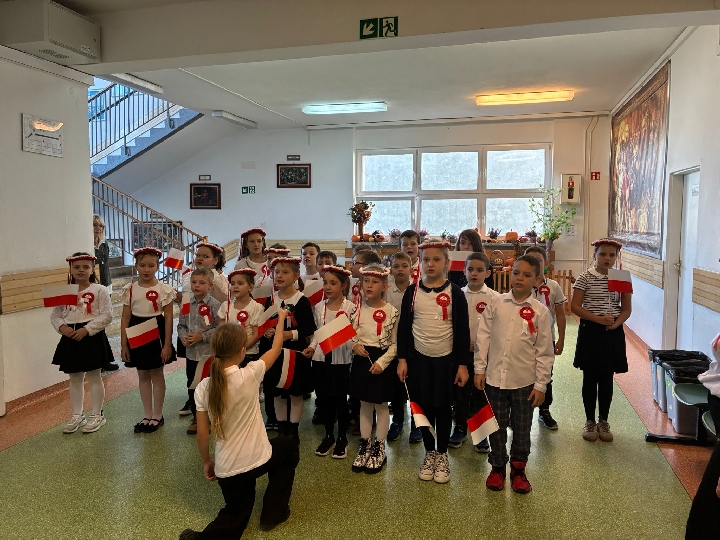 Na holu pierwszego piętra uczniowie klas I-III uczcili Dzień Niepodległości krótkim montażem słowno - muzycznym. Uczniowie klasy 2b recytowali wiersze patriotyczne, a wszyscy uczniowie piosenką zadeklarowali to, że jesteśmy Polakami i zaśpiewali piękną pieśń patriotyczną "Szara piechota".