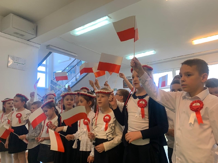 Wszyscy uczniowie ubrani byli na galowo, mieli przypięte kotyliony i chorągiewki, a cały korytarz tonął w biało i czerwonych