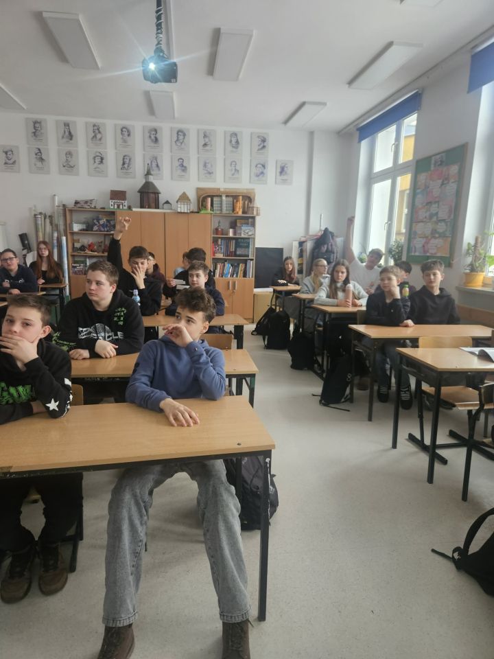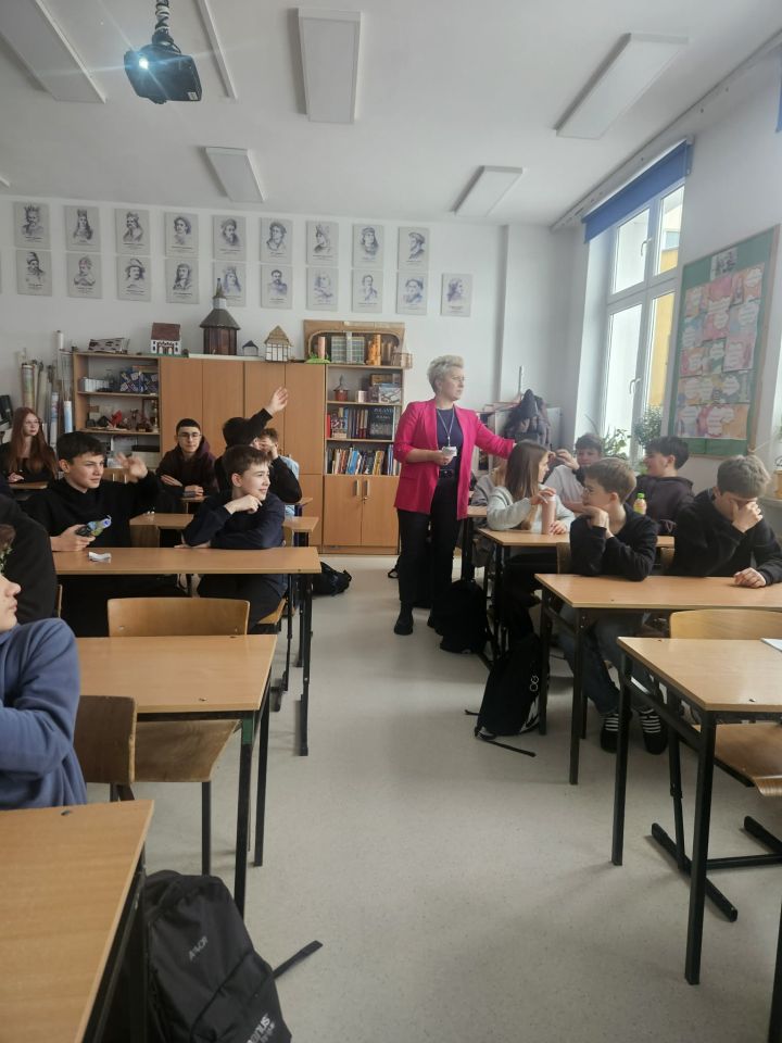 Dnia 27.01.2026 r. klasę 7b odwiedziła Pani Małgorzata Polańska- pracownik ZUS/ Oddziału Koszalinie, koordynator ds. komunikacji społecznej . Pani poprowadziła zajęcia, podczas których uczniowie dowiedzieli się, czym jest instytucja ZUS, jakie pełni zadania oraz jaką rolę odgrywa w systemie zabezpieczenia społecznego w Polsce. Omówione zostały m.in. rodzaje składek pobieranych przez ZUS (emerytalne, rentowe, chorobowe, wypadkowe oraz zdrowotne) oraz to, na co są one przeznaczane — m.in. na wypłatę emerytur, rent, zasiłków chorobowych